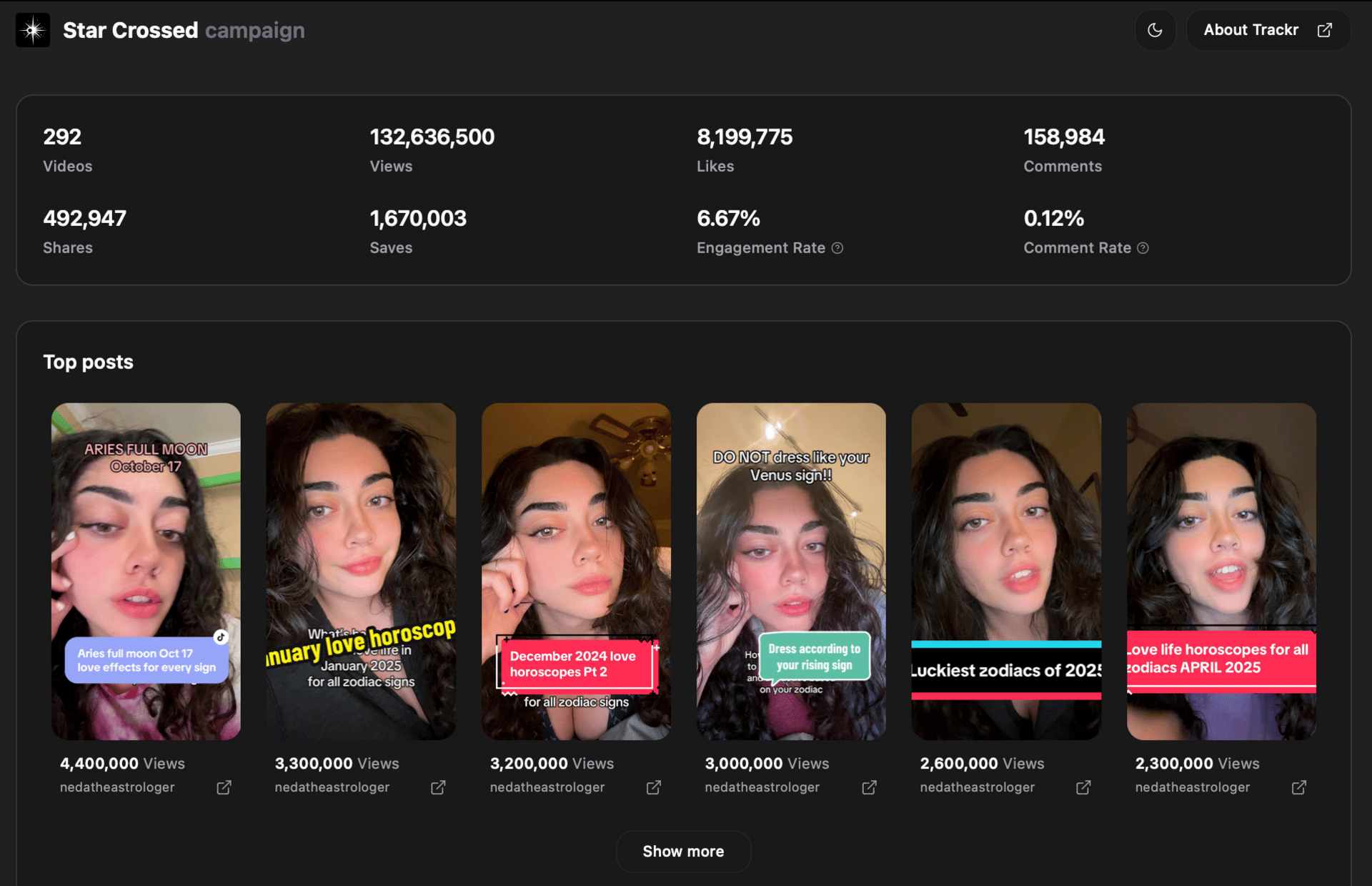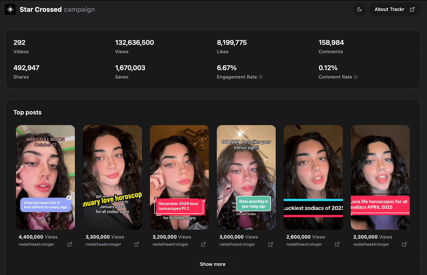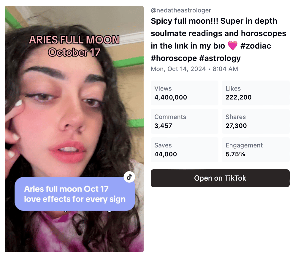 Their strategy centers around zodiac-specific content and personalized soulmate readings, with their overall most popular video from surpassing 130M views.